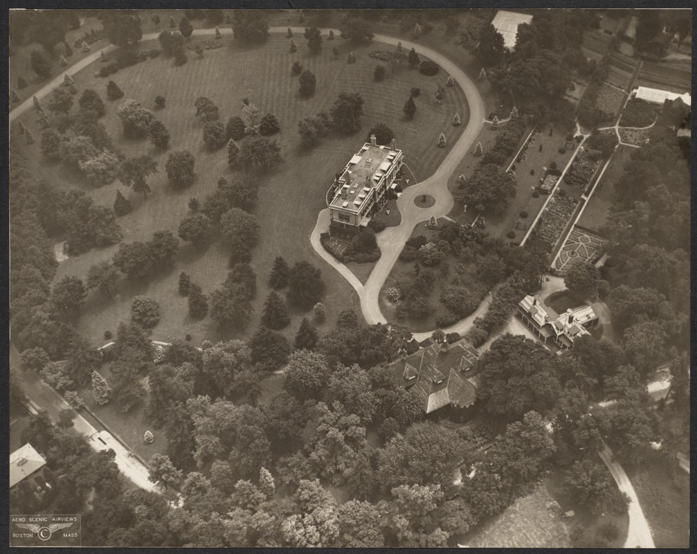 In the center is the house of Mrs. Hannah (Train) Weld, widow of Dr. Charles Goddard Weld. Goddard Ave. runs along the bottom of the photo with 15 Goddard Ave., still standing, visible in the lower left corner. The Weld house was purchased in 1946 and is still in use by the Hellenic College and Holy Cross Greek Orthodox School of Theology. The other Weld buildings are no longer standing.