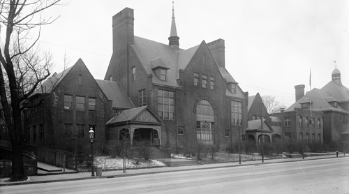 On the right is the Lincoln Grammar School. On the left is the first Manual Training School which opened in 1894. Both buildings became the Lincoln School when the Manual Training relocated to a new building on Tappan St. in 1903. On the far left is the entrance to Walnut Path.