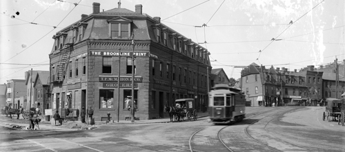- #164 (aka 166) Washington St. (corner of the Guild Building), first floor: Thomas H. McMahon, Grocer. In 1898, he took over the existing business in which he had been a clerk and maintained it until 1919 when the building was sold to and replaced by the Brookline Bank.