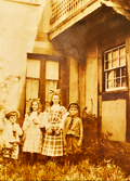 From left to right: James Burtis Saxe, Eleanor Saxe, unidentified, John Burtis Saxe. The family of John Walter Saxe, Sara Florence Burtis, and their three children lived here circa 1905 – 1912, the house is still standing.
