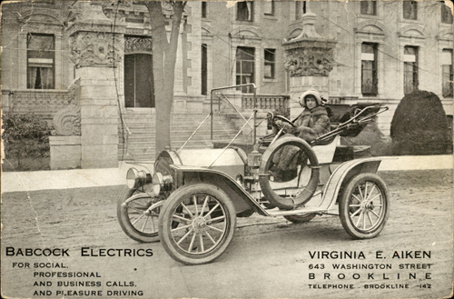 She lived with her father's sister Viola and Viola's husband, Day Baker, first at 145 Winthrop Road then at 33 Dwight St. Her uncle was the New England representative for the General Vehicle Co. (Buffalo, NY) and head of the Electric Vehicle Club of Boston. Remarkably, while still at the Runkle School, Virginia assumed the position of New England representative of the Buffalo-based Babcock Electric Carriage Company, responsible for sales throughout the six-state region. Aiken operated out of the Brandon Garage at 643 Washington Street, where she maintained an office, employed a stenographer and a bookkeeper, and kept several models of Babcock Electrics to demonstrate to prospective buyers. Extensive details are avalable at Muddy River Musings. | ||
