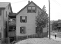 A partial view of the rear of a house facing Kerrigan Place is on the left. To its right is the side of 141 Boylston St. Across the street are, from left to right, the side of 98 Boylston St. (still standing), an outbuilding of 149 Walnut St., and 120/122 Boylston St.