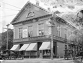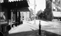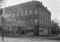 This is a rare photo of the Harvard Hall building just prior to its replacement after a battle with the town and the invocation of eminent domain. The town needed to widen both Washington St. and Harvard St. and was literally shaving off sections of the building which sat at the apex of the two streets. The grocer, T. H. Dyer, insisted on remaining open and the building owner, in litigation with the town, covered the reduced and now-asymmetrical building with makeshift boarding.