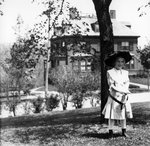 Looking at 169 Buckminster Rd. from the front lawn of 172 Buckminster Rd., the home of Edward Ruhl, both houses are still standing. The girl is unidentified.