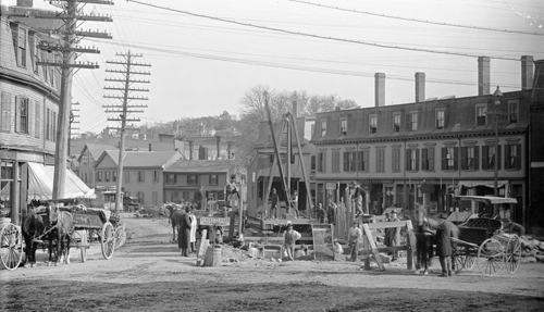 Tom Condon, Sr. Civil Engineer for Brookline writes: The work shown is part of the relocation of the outlet of the Village Brook. …(in the pile of lumber in the background you can see a piece of the curved falsework used to hold the brick arch until the cement mortar set.). Leverett Pond was created from the Muddy River marsh located just south of Washington Street by installing a stop plank manhole (in effect an adjustable height dam) in the new culvert under Washington Street. This stop plank manhole was necessary to hold back the pond since the Charles and therefore the Muddy Rivers were still tidal at that time. Presumably, Alexis French (who was both Olmsted's engineer and the Town Engineer) determined that more flow into this new pond was necessary. To provide this additional flow, the Village Brook which flows alongside what is now the MBTA "D" line was diverted into the culvert shown under construction. The culvert runs east down Washington Street, crosses Walnut Street, runs down Morss Avenue (now discontinued), across Pond Avenue and into Leverett Pond. (ID) 013 (Slide ID) P-13-13 (Notes) Replaces existing image William Robert Murphy Collection | ||